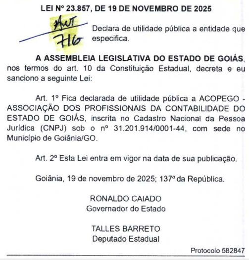 Temos a grata satisfação de informar que foi publicada a Lei Estadual nº 23.857, de 19 de novembro de 2025, que declara de Utilidade Pública a ACOPEGO – Associação dos Profissionais da Contabilidade do Estado de Goiás.